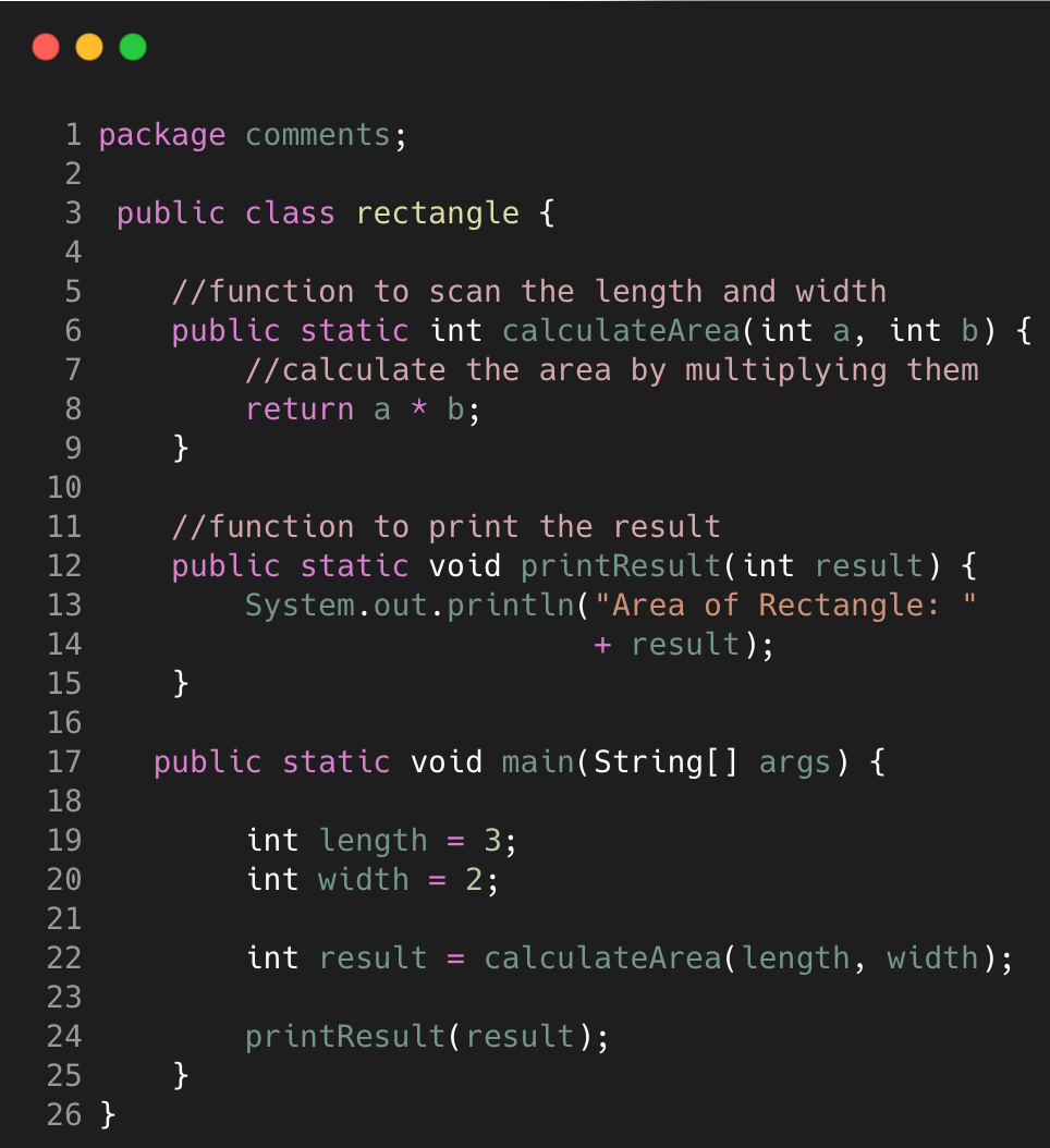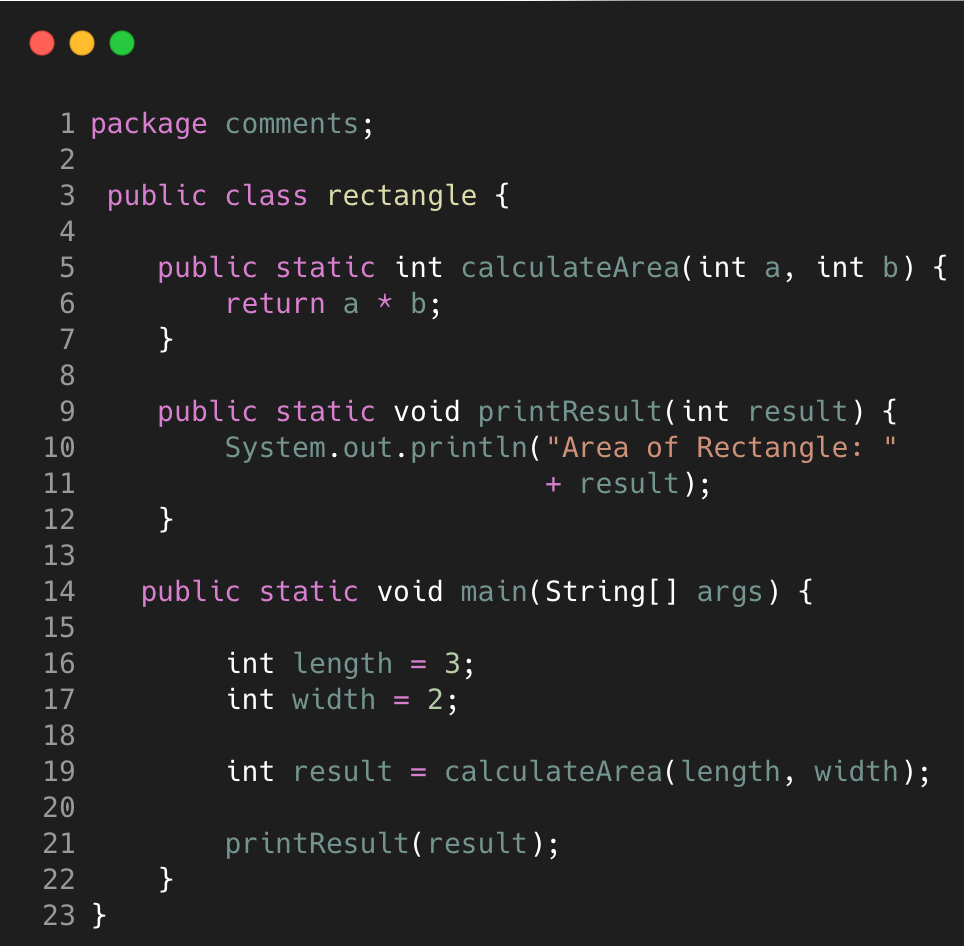 Pada contoh code di atas, sebelumnya terdapat comment untuk menjelaskan fungsi dari method yaitu menghitung luas persegi panjang dan memberi output hasilnya, dimana nama dan alur dari kedua method tersebut sebenarnya sudah jelas.