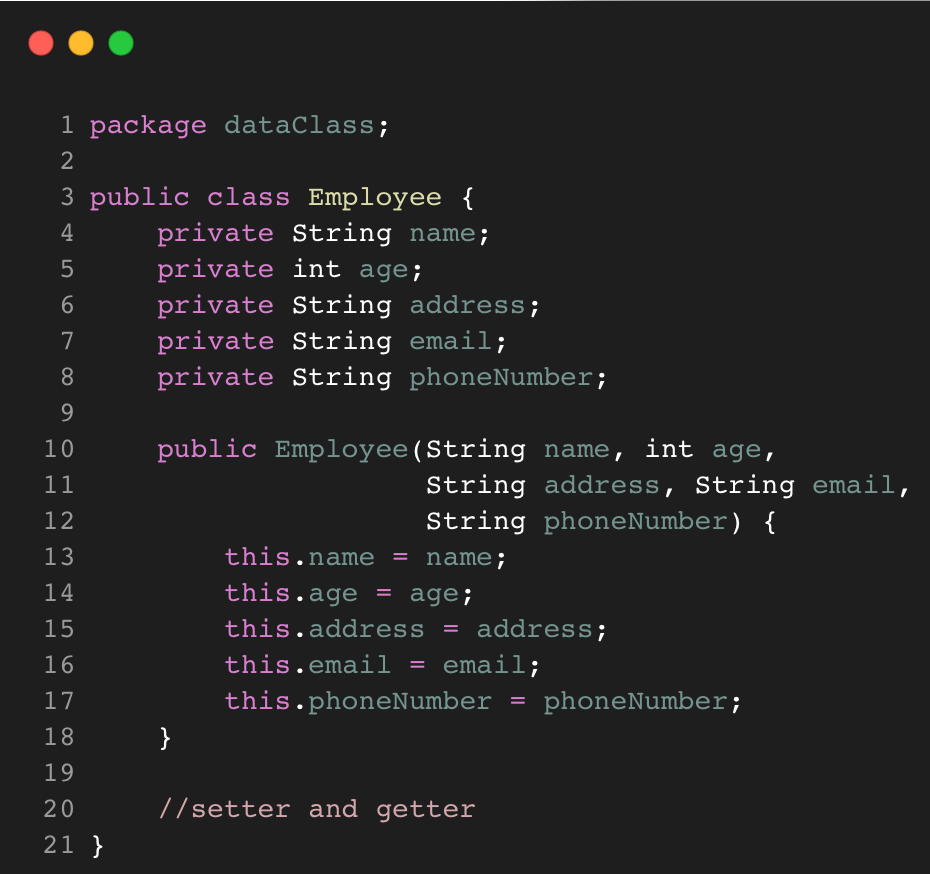 Data Class terjadi ketika terdapat sebuah class yang hanya terdiri dari data serta constructor, setter, dan getter untuk data tersebut. Jadi, class ini berisi data yang akan dipakai atau diakses oleh class lain, tidak mengandung fitur atau fungsionalitas lain. Smell ini sering terjadi pada awal proses pembuatan class, tetapi seiring dengan berkembangnya sebuah class haruslah memiliki fungsionalitas. Data Class dapat ditangani dengan melakukan review pada class-class lain yang menggunakan data dari Data Class dan mencari method yang dapat dipindahkan ke Data Class.
