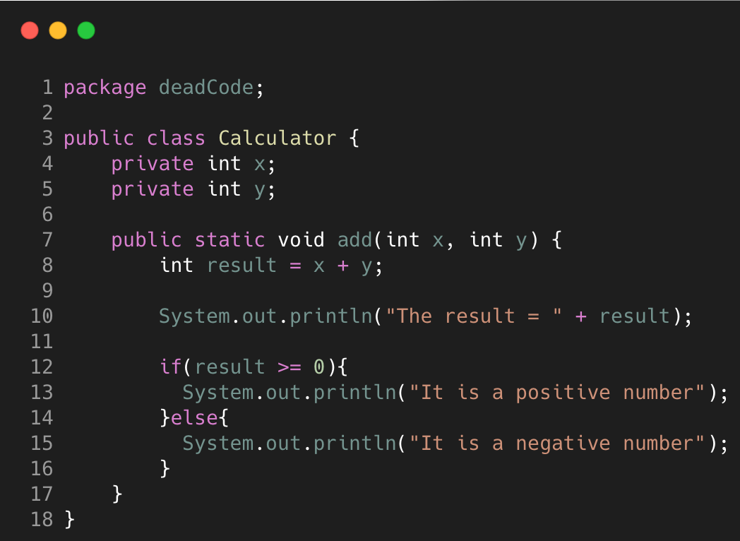 Dead Code terjadi ketika terdapat variable, parameter, field, method, atau class yang tidak dipakai lagi atau tidak tersentuh ketika code dijalankan. Hal ini sering terjadi seiring berkembangnya code, terdapat bagian code yang tidak lagi digunakan dan tidak dihapus sehingga membuat code tidak relevan. Dead Code dapat ditangani dengan menghapus code yang sudah tidak digunakan lagi atau jika bagian tersebut dibutuhkan maka melakukan implementasi agar saat code dijalankan bagian tersebut akan berfungsi.