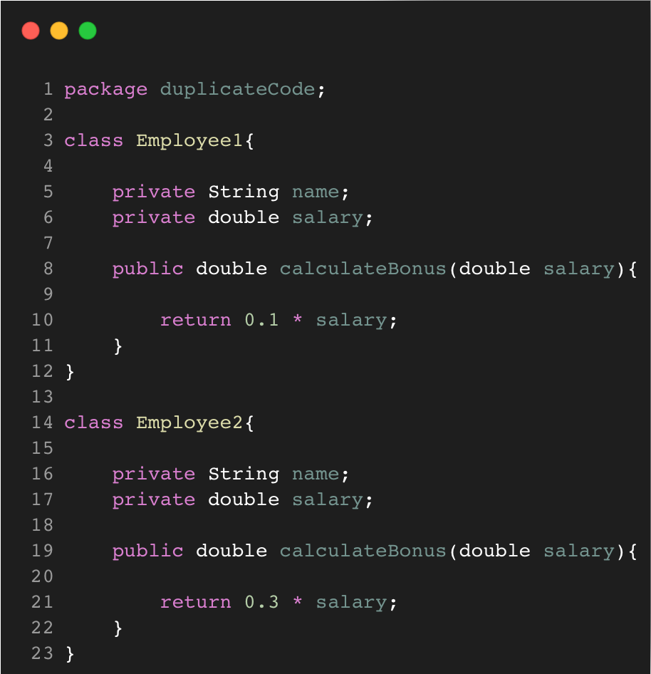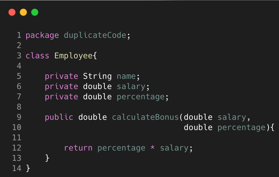 Duplicate Code terjadi ketika terdapat dua atau lebih bagian code yang identik atau mirip. Hal tersebut dapat terjadi karena seringnya dilakukan copy paste dalam membuat code atau terdapat dua programmer yang mengerjakan code tersebut. Hal ini dapat menyebabkan kerumitan dalam mengelola code kedepannya. Duplicate Code dapat ditangani dengan extract method apabila class berada dua subclass pada level yang sama atau extract superclass jika code terdapat di dua class berbeda.