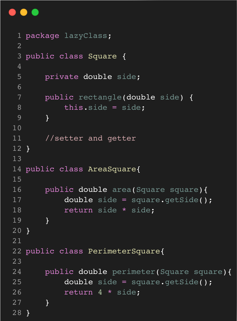 Lazy Class terjadi ketika terdapat class yang memiliki sedikit atau bahkan tidak ada fitur/metode yang diimplementasikan. Hal ini dapat terjadi setelah dilakukannya refactoring agar fitur-fitur code terbagi, tetapi malah menghasilkan class yang memiliki fungsi minim. Lazy class dapat ditangani dengan menambahkan metode yang berkaitan ke dalam class tersebut atau menyatukannya dengan class lain.