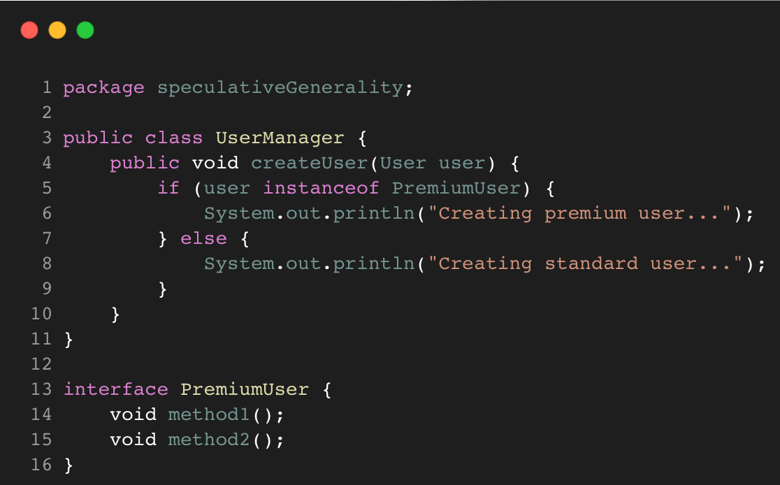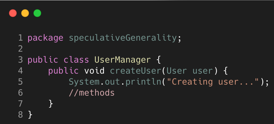 Speculative Generality terjadi ketika terdapat variable, parameter, field, method, atau class yang dibuat bertujuan untuk persiapan jika akan dibutuhkan di masa depan. Hal ini terjadi karena programmer berspekulasi bahwa bagian tersebut akan digunakan tetapi ternyata saat code dijalankan setelah beberapa lama, bagian tersebut tidak dibutuhkan. Speculative Generality dapat ditangani dengan mengahpus variable, parameter, field, method, atau class yang memang tidak diperlukan.